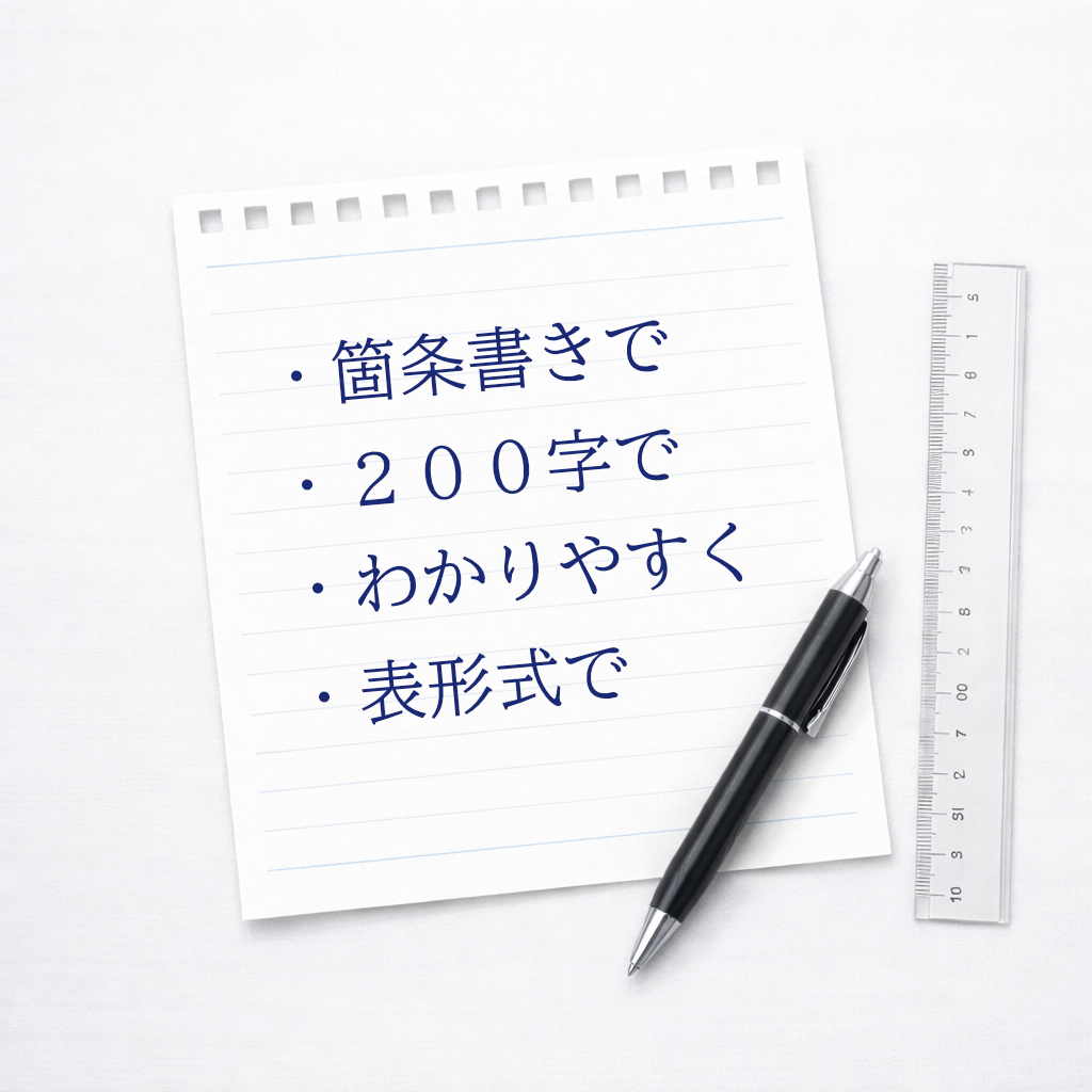 - 出力の形を指定する(箇条書き・字数・難易度など)