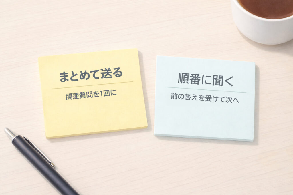 一方で、前の答えを受けてから次を聞く必要がある場面では、まとめない方がうまくいきます。