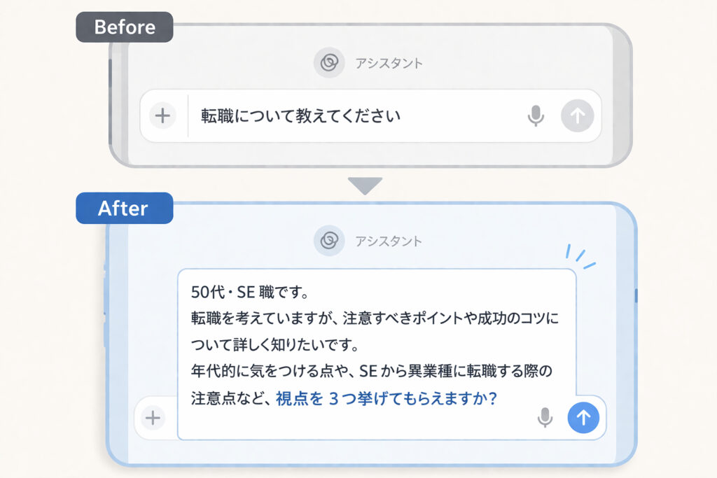 ChatGPT・Claude・Geminiのいずれで試しても、「年齢・職種・判断基準」を踏まえた具体的な視点が返ってきました。伝え方を変えただけで、答えの質が変わります。