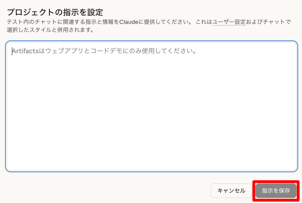プロジェクトの指示指定欄にchat_Project用_instructions.mdの内容を貼り付けて、「指示を保存」をクリックします。