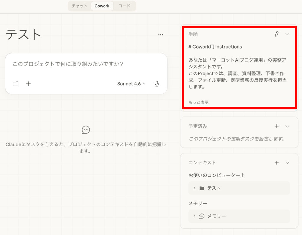 指示を編集欄に、Cowork用_instructions.mdの内容を貼り付けて、「保存」をクリックします。