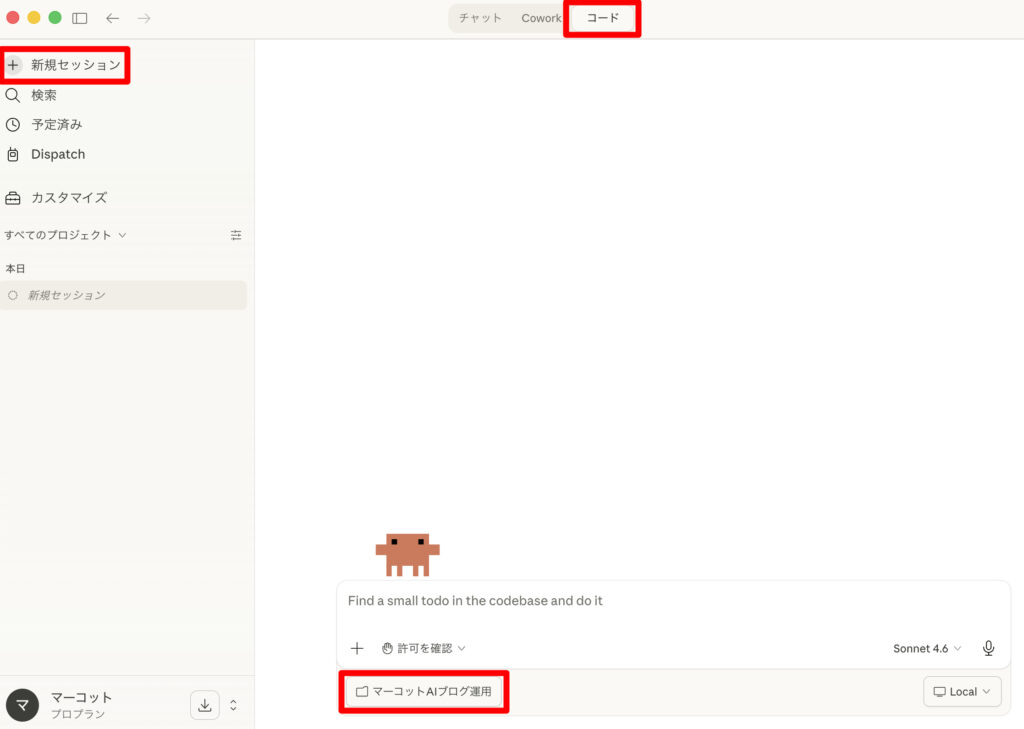 コードタブを選択して、プロジェクトの「+新規セッション」を選択して、さきほどご自身のMacのローカルフォルダに作成したプロジェクトフォルダを選択します。