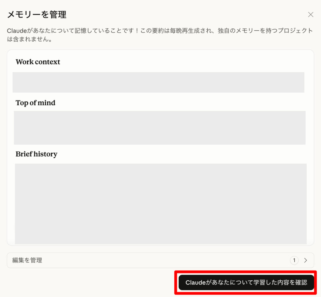 インポートが完了すると、インポートした内容が表示されるので、期待した内容であれば「Claudeがあなたについて学習した内容を確認」をクリックします。