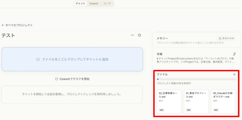 Claude AI・Cowork・Claude Codeのどの環境でも一貫した前提で動かせるので、プロジェクトの内容が複雑になるほど効いてきます。