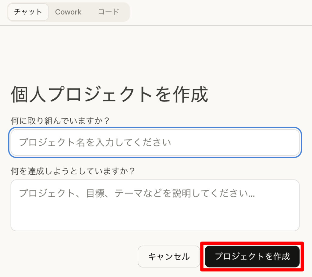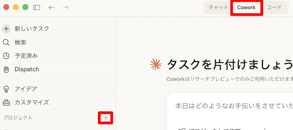 Coworkタブを選択して、プロジェクトの「+」をクリックします。