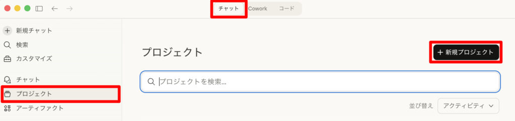 チャットタブを選択して、プロジェクトを選択。「+新規プロジェクト」をクリックします。
