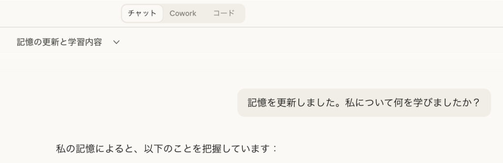 Claude AI(チャットプロジェクト)が表示され、「記憶を更新しました。私について何を学びましたか?」というプロンプトが自動で入力され、インポート結果が出力されます。