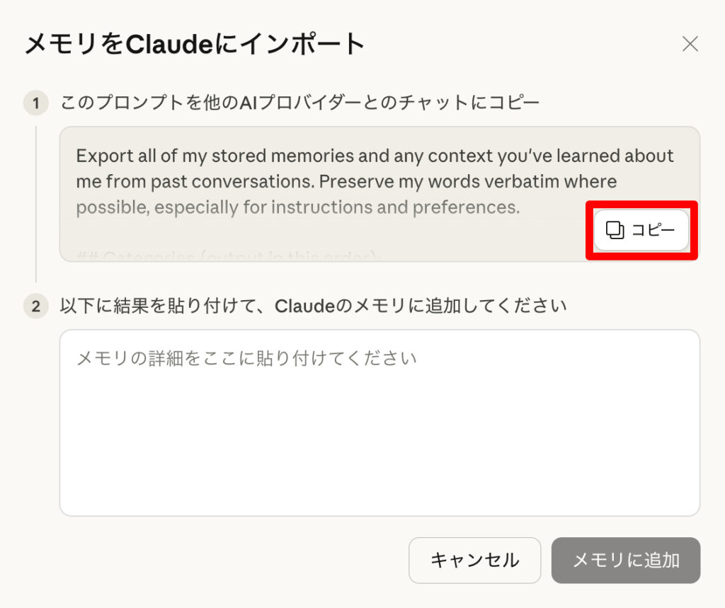3.Claude側がエクスポート用の文章(プロンプト)を表示するので、それをコピーしてChatGPTに貼り付ける