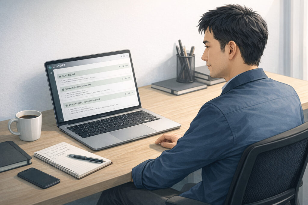 ChatGPTに依頼して、Claude AI・Cowork・Claude Code向けの設定ファイルをまとめて作成してもらう方法です。