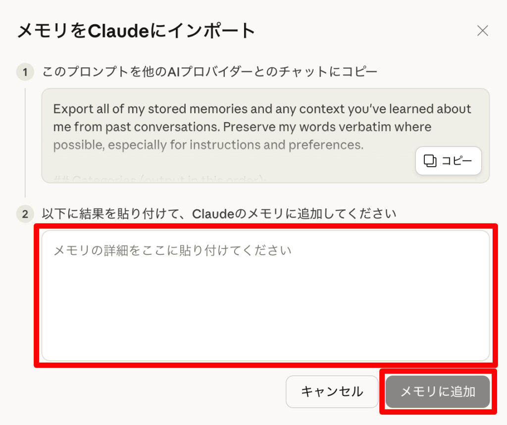 ChatGPTが出力した内容を、②欄に貼り付けて「メモリに追加」をクリックしてください。
