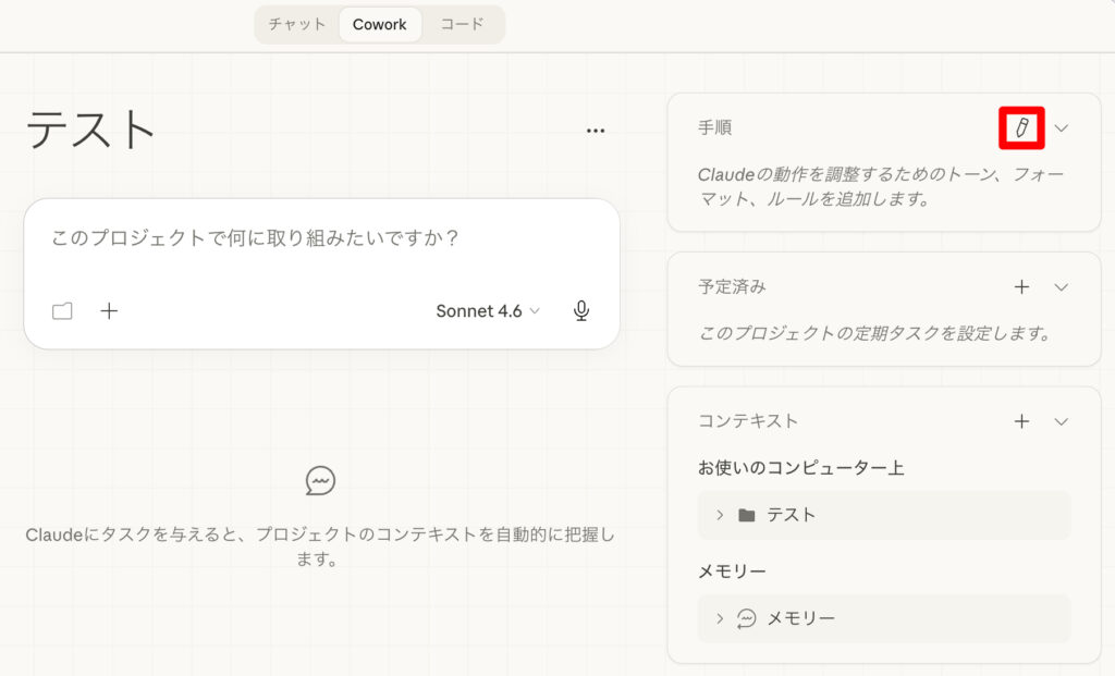 Coworkの作成したプロジェクトが表示されるので、手順欄の鉛筆アイコンをクリックします。