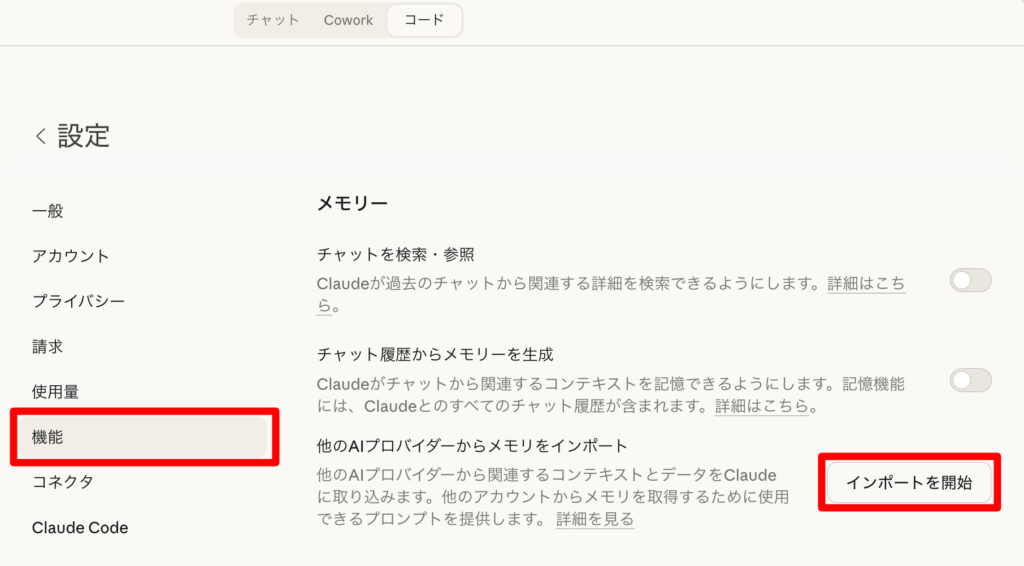 - この方法で取り込まれるのはClaudeの「メモリ機能」だけです。