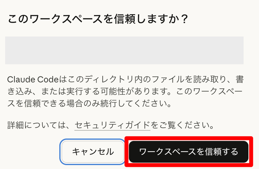 また、初回入力時には「このワークスペースを信頼しますか?」と表示され、プロジェクトフォルダのパスも確認できます。