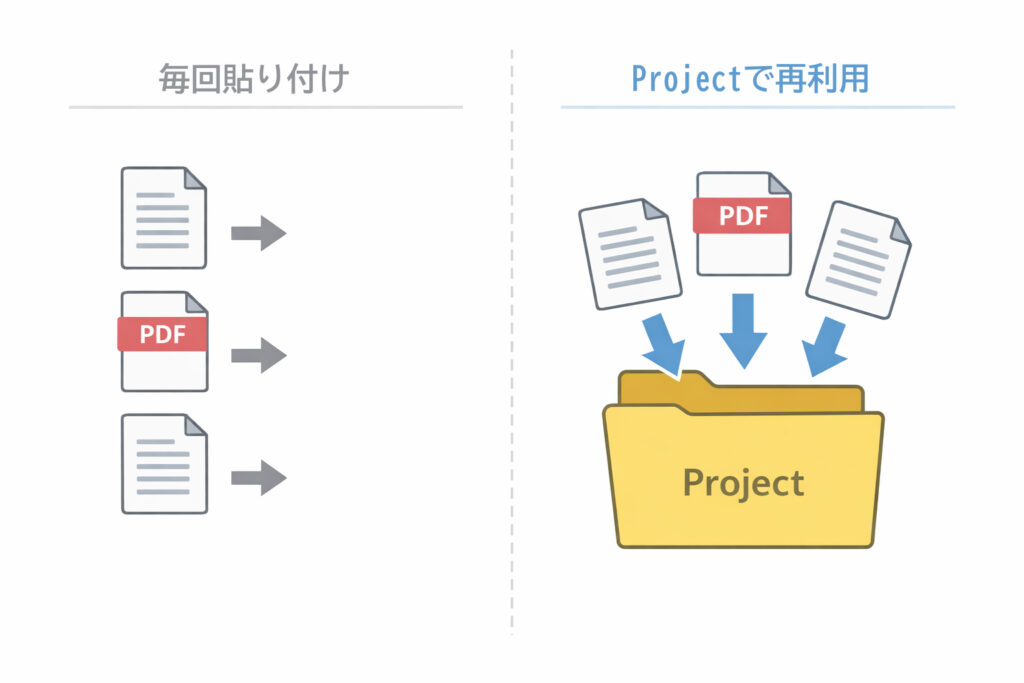 毎回PDFや長い文書をチャットに貼り付けると、そのたびに読み込み分の使用量が発生します。