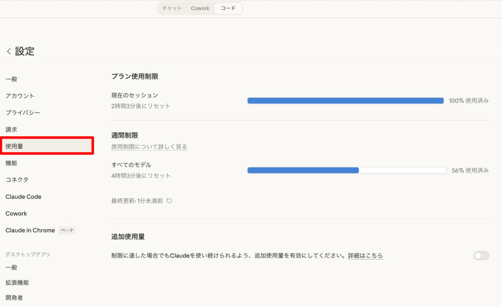 | 追加使用量オフ | 上限に達すると止まる。急ぎの用事があるなら一時的にオンにするか、別の手段を検討 |