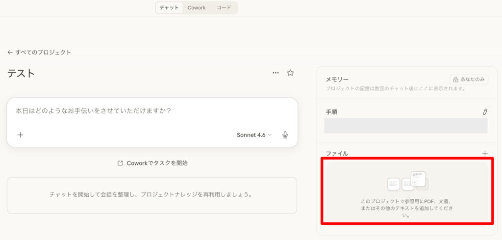 CoworkおよびClaude Codeは、PC上のローカルファイルに直接アクセスできるため、Projectへのアップロードは基本的に不要です。「このフォルダの〇〇ファイルを見て」と指示するだけで参照できます。